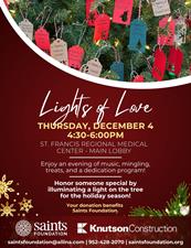 Saints Foundation Lights of Love is annual honorary event kicks off the holiday season with a dedication program, music, tree lighting, cookies, cider, and hot chocolate. Nearly 300 souls are honored at the annual Lights of Love tree lighting ceremony at St. Francis each year.